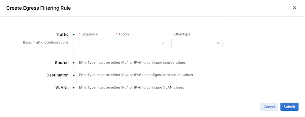 Validation failed: EtherType is mandatory for egress filtering rule