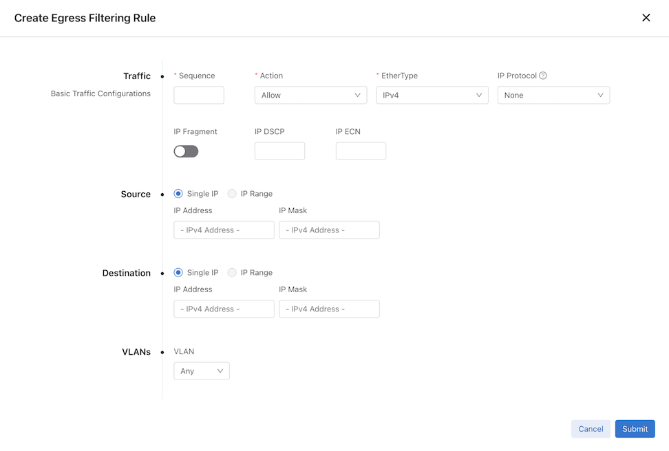 - Egress filtering supports only 500 rules per interface. A validation failure occurs when exceeding this limit.