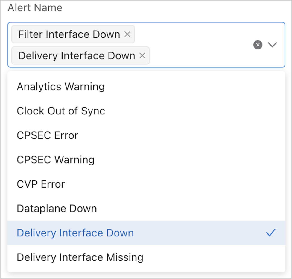 - Alert Name: Use the drop-down menu to select a specific or multiple alert names to filter the list.