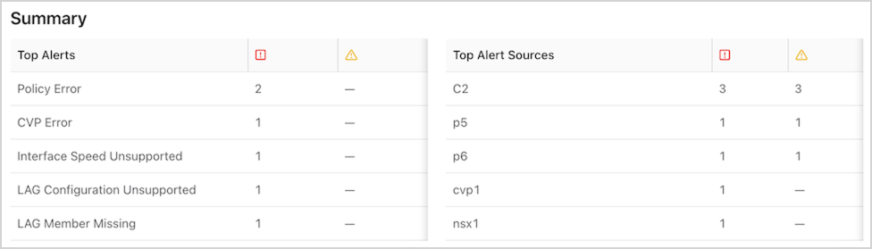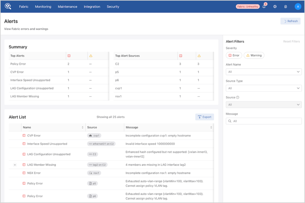 - Source: The origin of the alert (e.g., policy name, switch name, etc.).