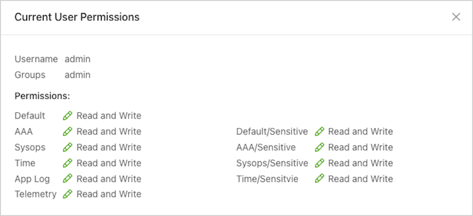 Selecting the User Account icon opens a Current Users Permissions window.