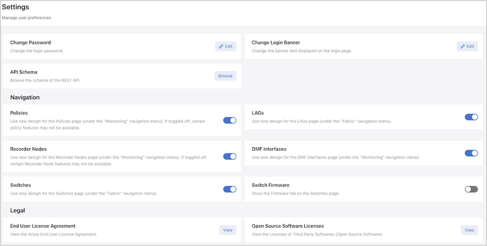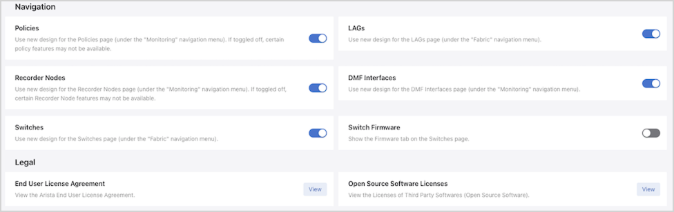 - Navigation and Legal: Configure the user interface preferences and view license details.