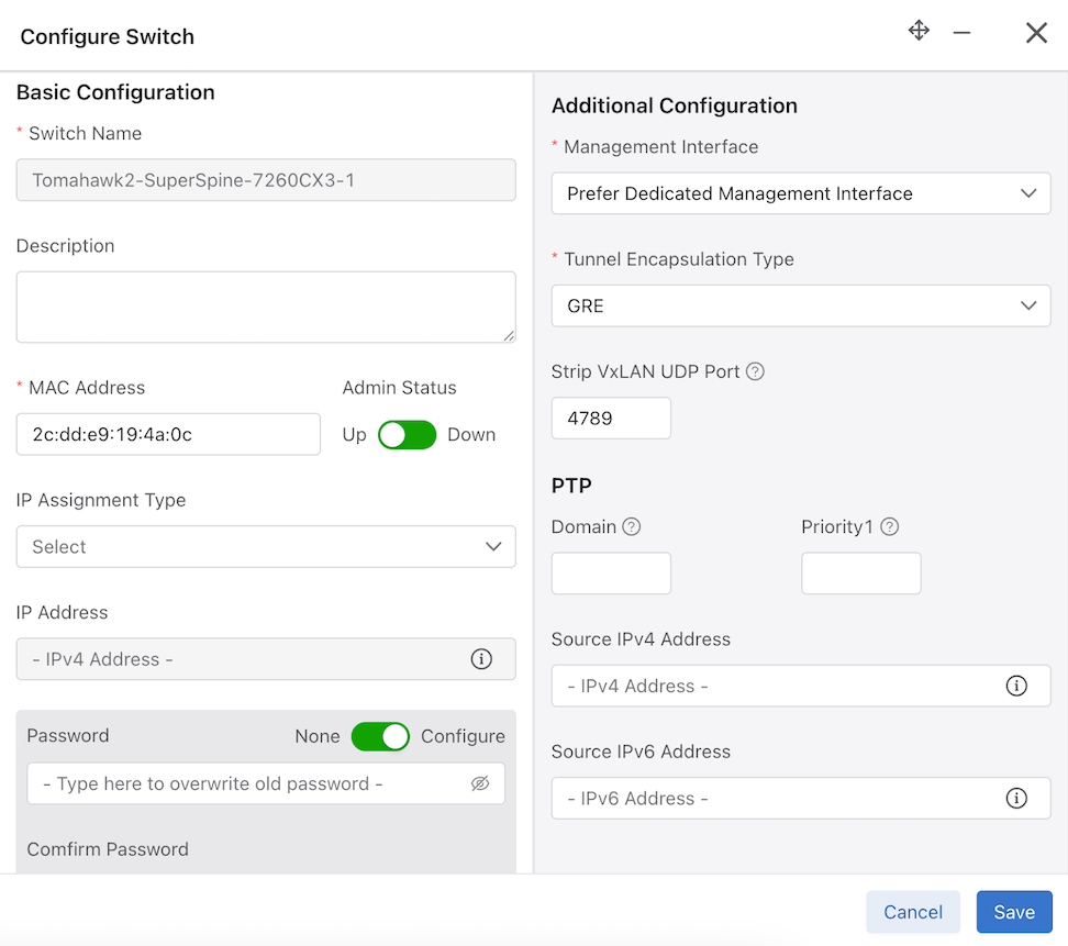 - Configure: Opens the Configuration Switch window with pre-populated switch information. Edit the configuration as required and select Save.