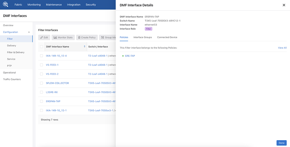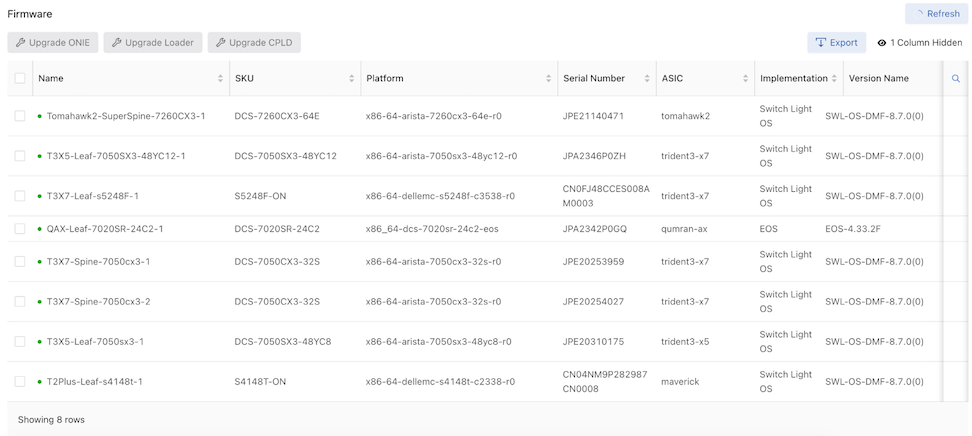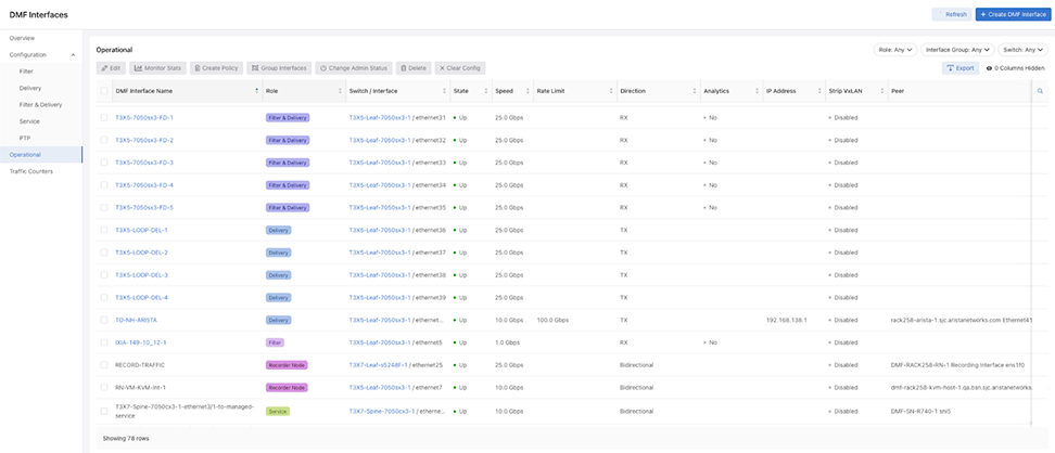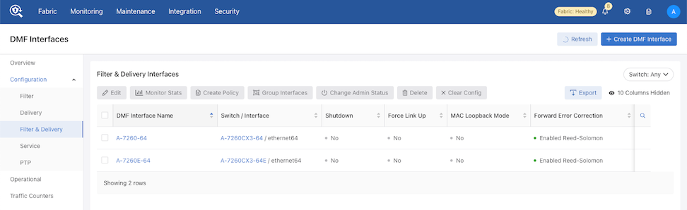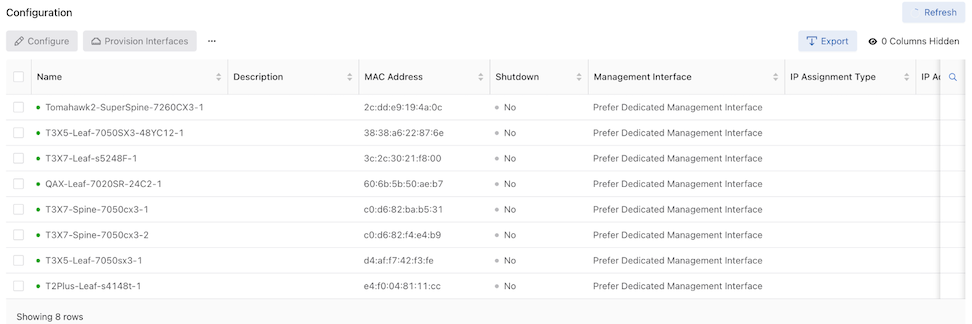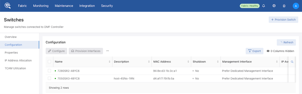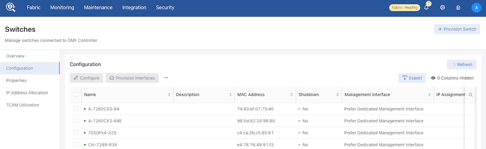 Configuration Details: A sortable display of all configurations of the switches currently installed in DMF.
