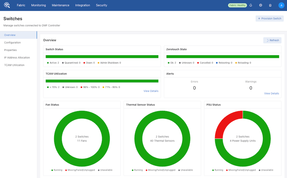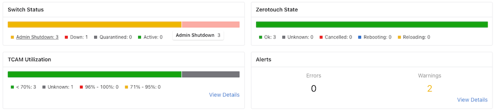 - Alerts: Displays the count of relevant switch alerts and warnings. The View Details link navigates to the Alerts page.