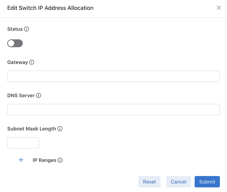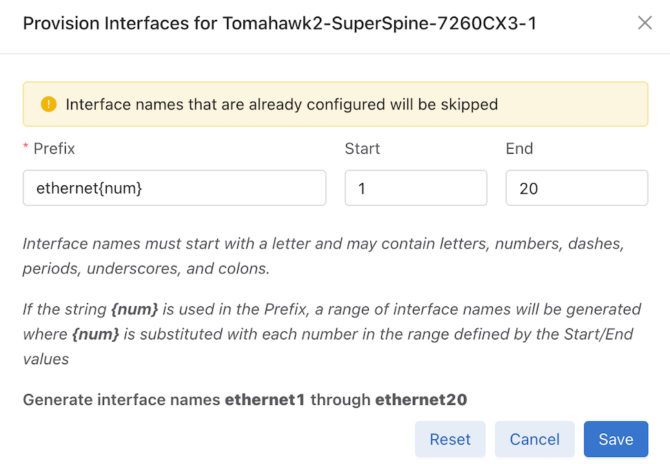 {num}is replaced by a number between start and end, if present.Provision Interfaces is disabled unless one switch is selected.