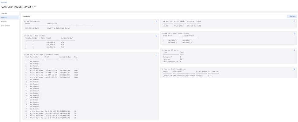 DMF displays the inventory information for EOS switches in block format. Each block displays a different aspect of the inventory and contains a copy icon enabling quick data copying.