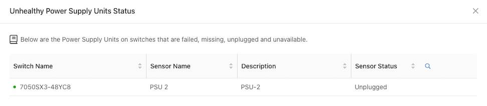 - PSU (Power Supply Unit) Status: displays the switches count, PSU count, and a donut chart showing the percentage of PSUs with unhealthy status.