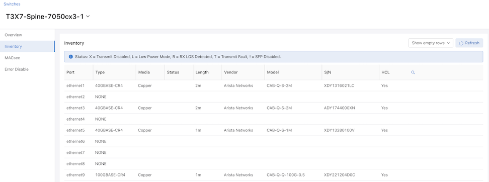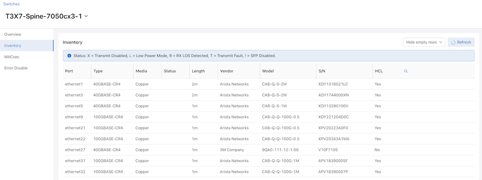 The Switch detail page in the DMF GUI has an Inventory tab displaying information about optics, cables, and transceivers.