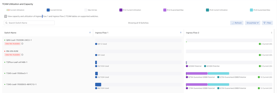 - TCAM Utilization: Displays the TCAM usage of all switches. The View Details link navigates to the TCAM Utilization and Capacity view.