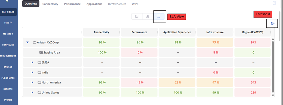 Network Administrators can configure the thresholds for various KPIs, and the thresholds apply to all locations. The SLA Dashboard highlights all the underperforming KPIs that cross the threshold for each location.