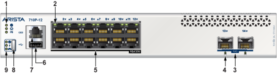 | 1 | System Status LEDs | 7 | Ethernet RJ45 ports with 30W PSE |