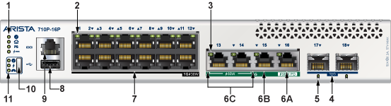 | 5 | PoE Ports | 11 | Mode status LEDs |