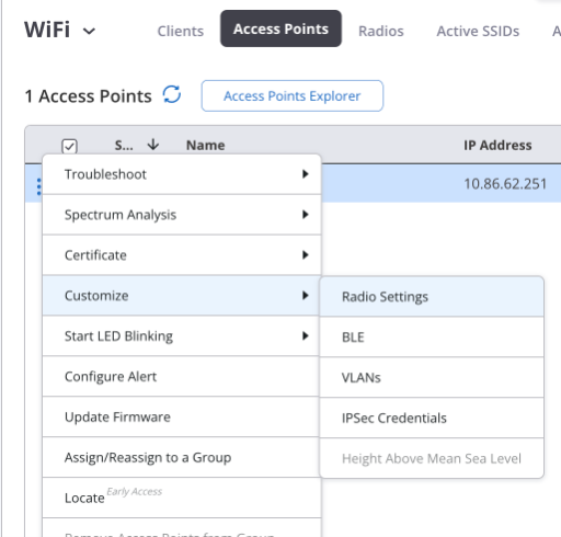 - Select the radio of the access point and click the three-dot menu to open the context menu.