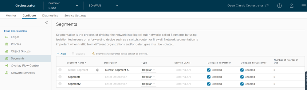 - After you have configured 128 segments for an Enterprise, you cannot downgrade your Edges to a version lower than 4.3. If you need to downgrade your Edges, ensure that you have only 16 segments, which is the default value for any Enterprise and delete the remaining segments before you downgrade the Edges.