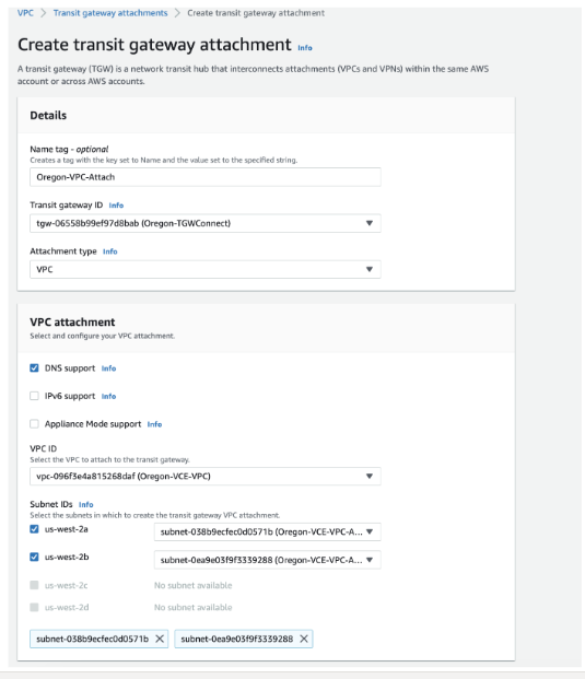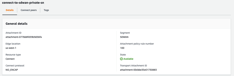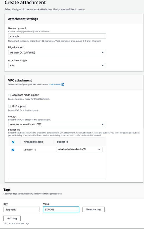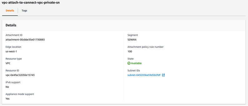 - VPC Attachments: Each SD-WAN Transport VPC will have a VPC attachment to its respective CNE. At least one subnet within the VPC must be specified when the VPC Attachment is created. In this example, The CNE in the us-west-1 AZ peers with the SD-WAN Transport VPC’s private LAN subnet. A key-value pair defining Segment membership is also necessary.