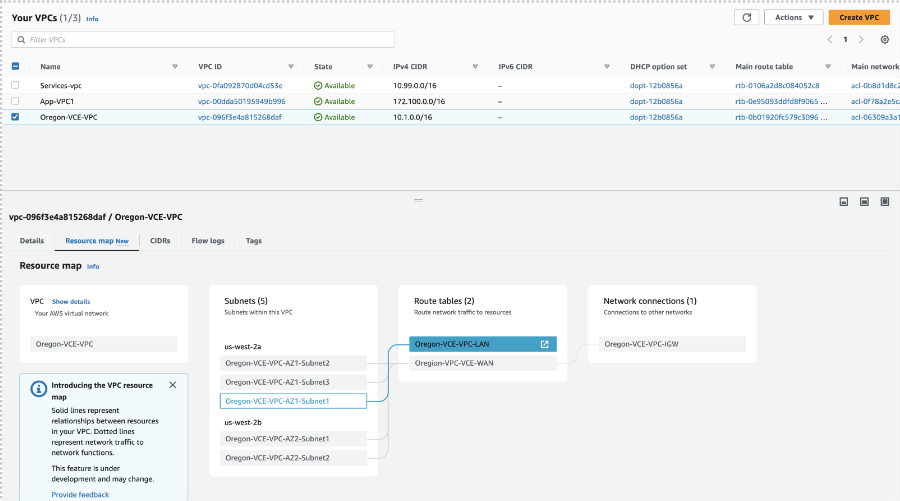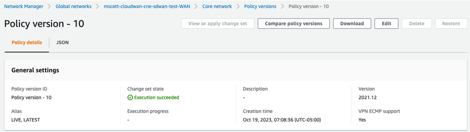 VeloCloud SD-WAN Virtual Edges (vEdges) are typically deployed in what AWS calls a “Transport” VPC. This Transport VPC may then peered with other VPCs, TGWs, or in this case, a CNE (Cloud Network Edge) in the Cloud WAN backbone to achieve connectivity with resources the customer has homed into AWS.