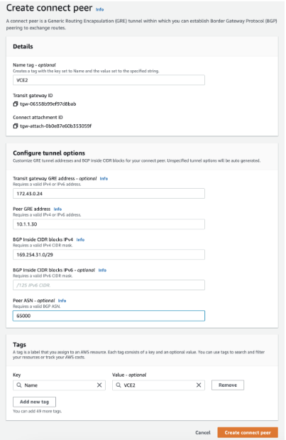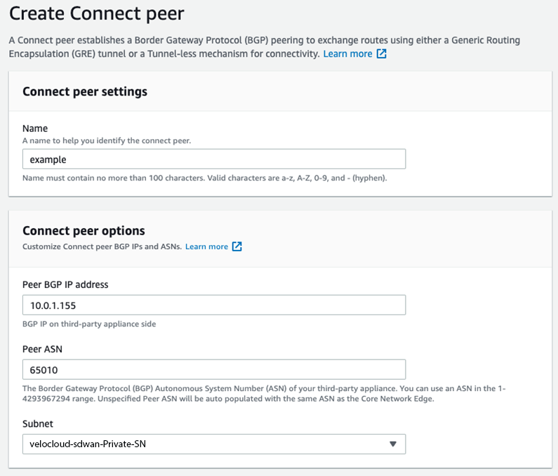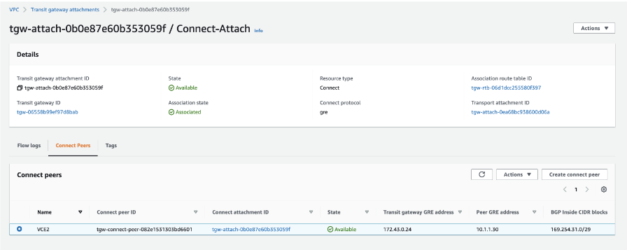 - Connect peers are created under the Connect Attachment. This is where the SD-WAN vEdge BGP peerings are defined in terms of the ASN and peer IP address.
