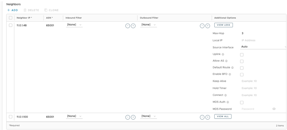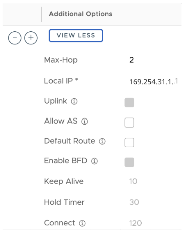 - When creating the BGP neighbors, set “Max-Hop” to 2 or more under Additional Options.