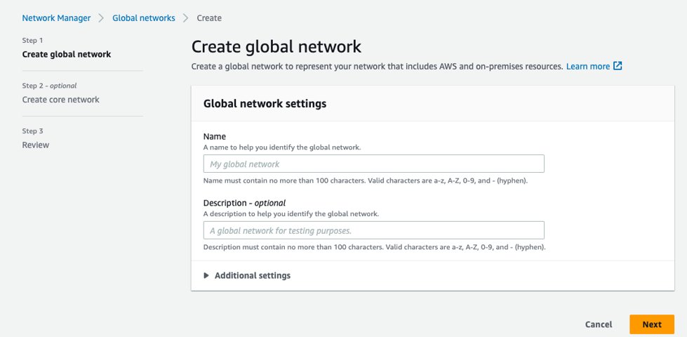 - On the AWS console, AWS Network Manager must be used to create a Global Network, if one does not already exist in the customer’s AWS deployment.