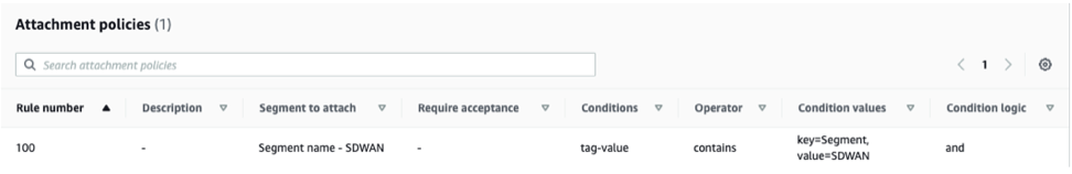 Note: Whatever value is used must match the value defined in the policy. - Attachment policies specify which Segments the VCP and Connect Attachments are a part of and what criteria are used. Search for the Attachment Policies in the appropriate text box, as shown in the following image. In this example, a “tag-value” condition defines membership in the “SDWAN” segment defined above. The “Condition Values” are the key-value pair also defined above. This key-value pair must be present in VPCs and/or subnets for them to become Segment members.