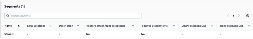 Note: The ASN and Inside CIDR Blocks for each Edge location are defined within the range defined above for the Global Network. - Search for Segments in the appropriate text box, as shown in the following image. Logical segments are defined using Tags. VPCs and Subnets may be tagged to define which segments they are a member of. In this example, the format is Key = “Segment”, Value = “SDWAN”, although the value is arbitrary.