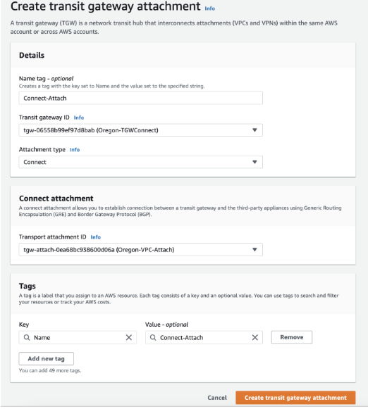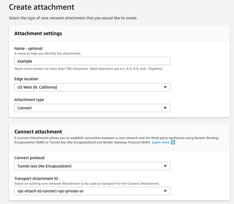 - Connect Attachments are where “Tunnel-less (No Encapsulation)” is configured. The Connect Attachment configuration must specify an existing VPC Attachment as the Transport Attachment ID, so the VPC Attachment must be configured first. As with the VPC Attachment, tags for Segment membership must be configured.