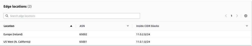 Once created, the AWS Console will provide two Core Network BGP peer IP addresses to use on the SD-WAN side of the BGP neighborship. These IPs will be selected randomly from the “Inside CIDR range” defined in the “Edge Locations” portion of the Policy above.