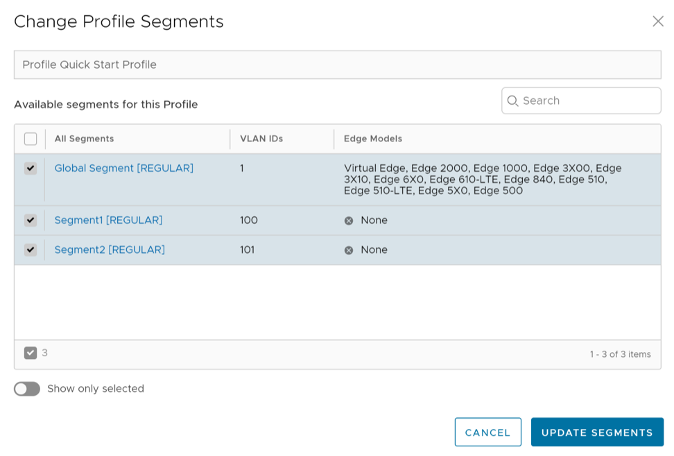In the SD-WAN service of the Enterprise portal, you can perform various configuration settings for a Profile by navigating to the tab. For additional information about Segmentation, see Configure Segments.