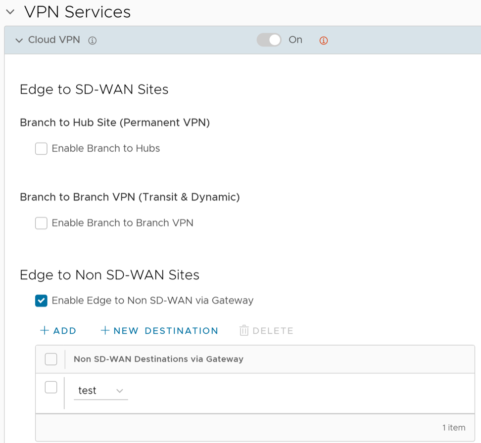 Select Add to add Non SD-WAN Destinations. Select New NSD via Edge to create new Non SD-WAN Destination via Edge. See Configure Non SD-WAN Destinations via Edge. |