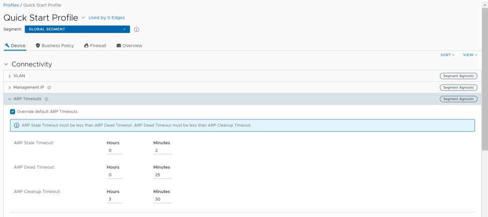 At the Edge-level, you can override the inherited ARP Timeouts for specific edges. For additional information, see Configure Address Resolution Protocol Timeouts for Edges.