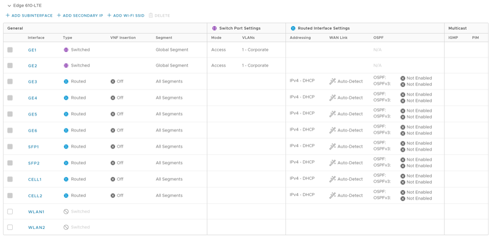 | Interfaces | Configure the Interface Settings for each Edge model. See Configure Interface Settings for Profile. |