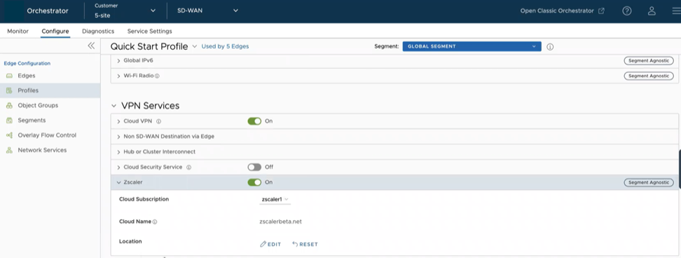 | Zscaler | Allows to establish a secured tunnel from an Edge to Zscaler sites. See Configure Zscaler Settings for Profiles. |