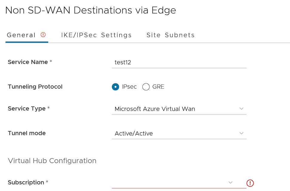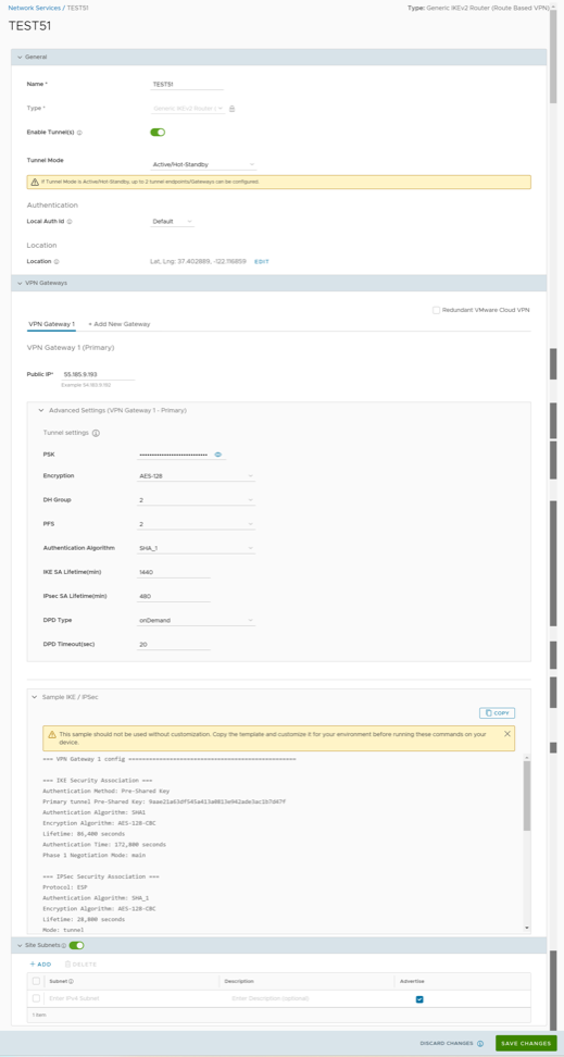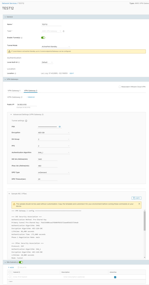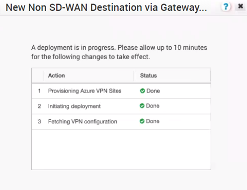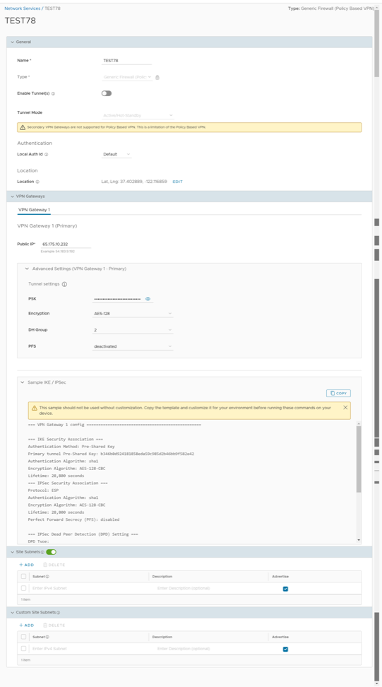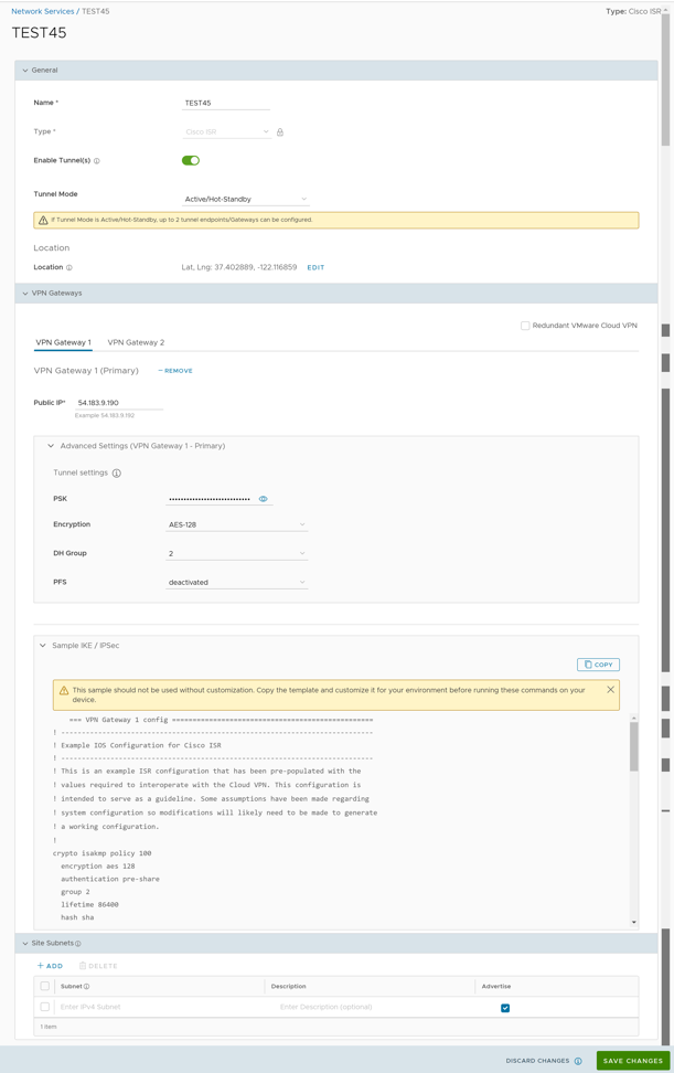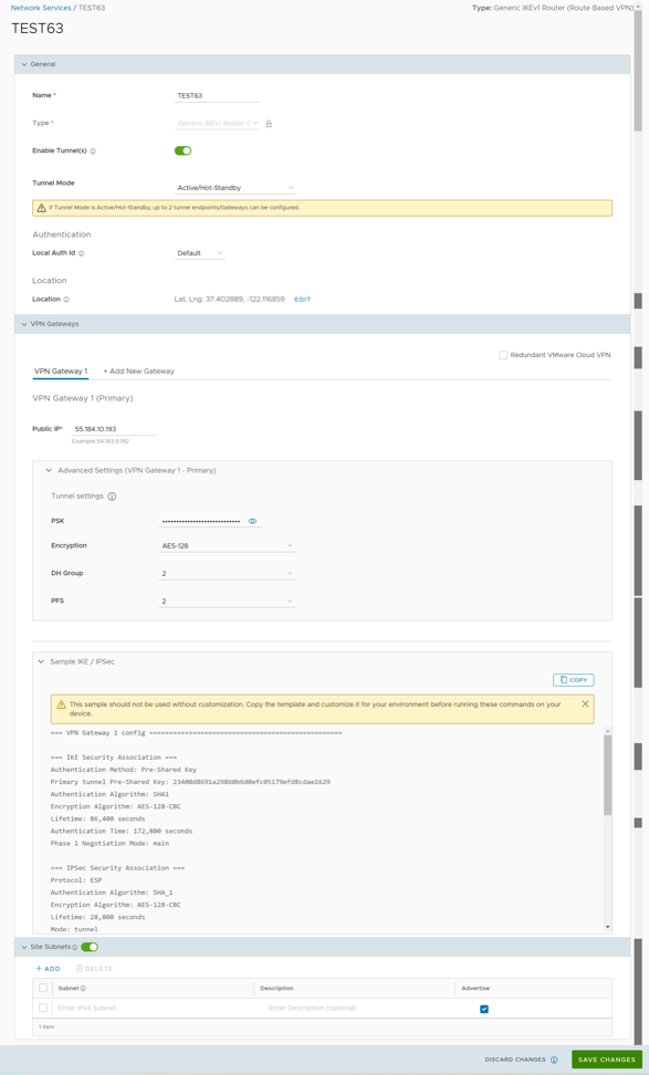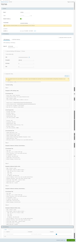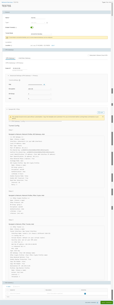 This is an optional service that allows you to create VPN tunnel configurations to access one or more Non SD-WAN Destinations. It provides the configuration required to create the tunnel(s) – including creating IKE IPsec configuration and generating a pre-shared key.