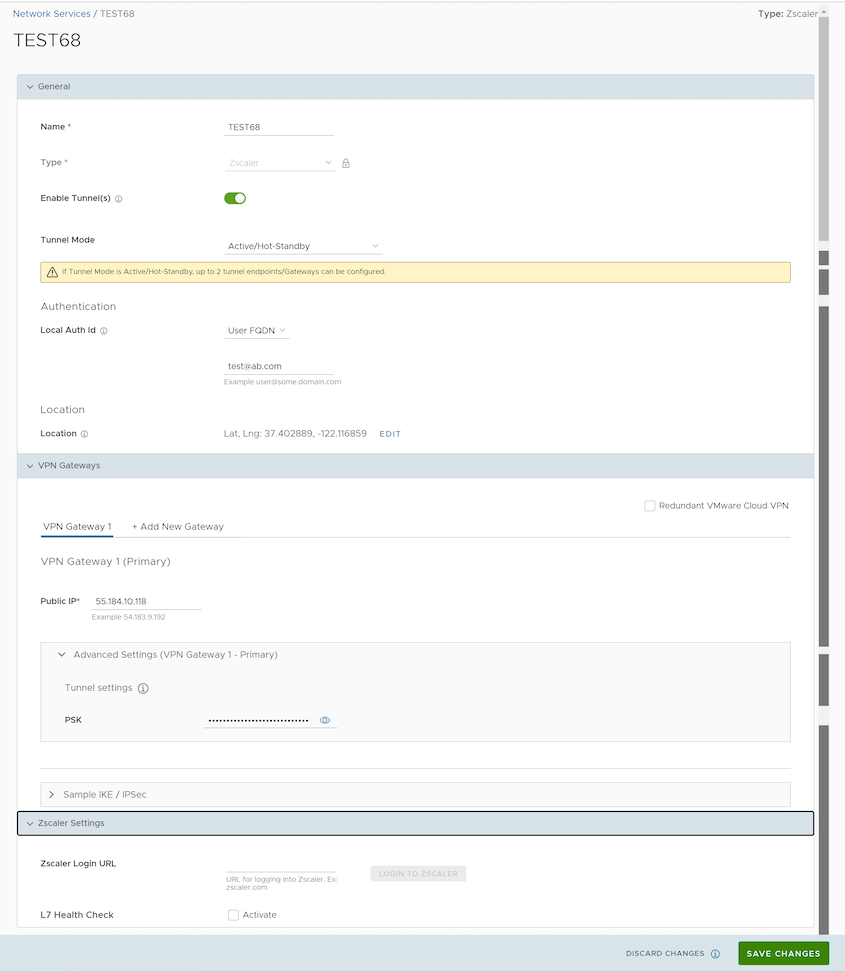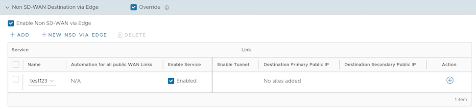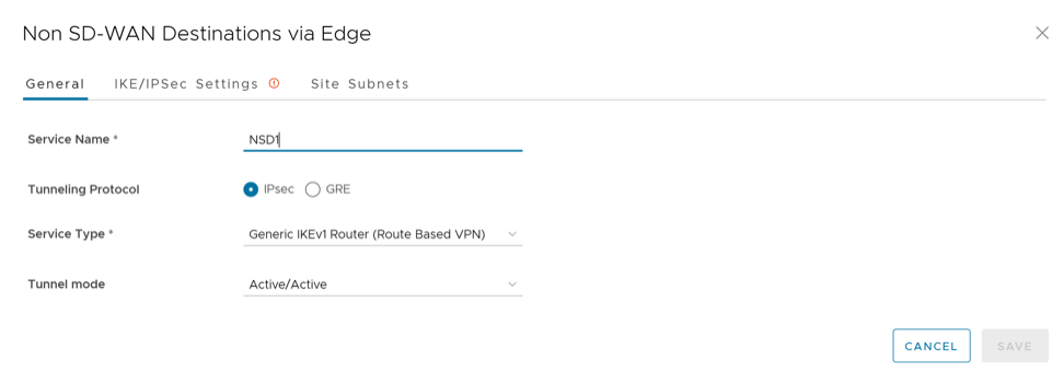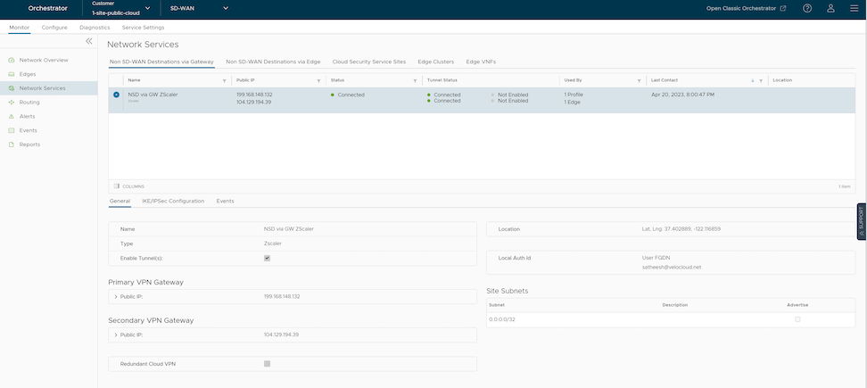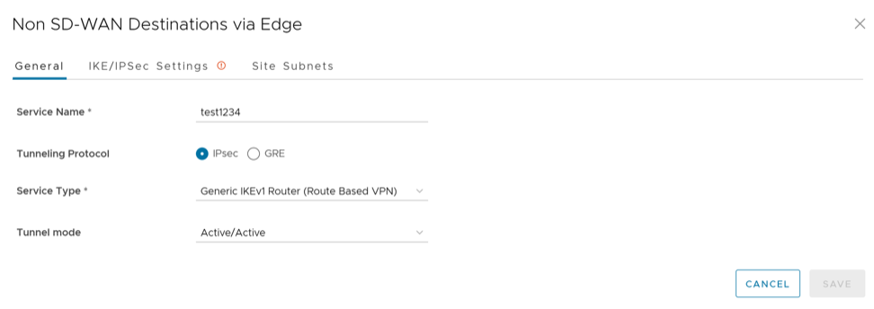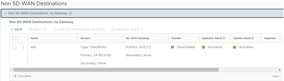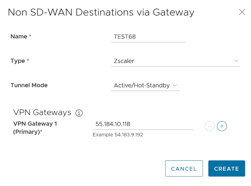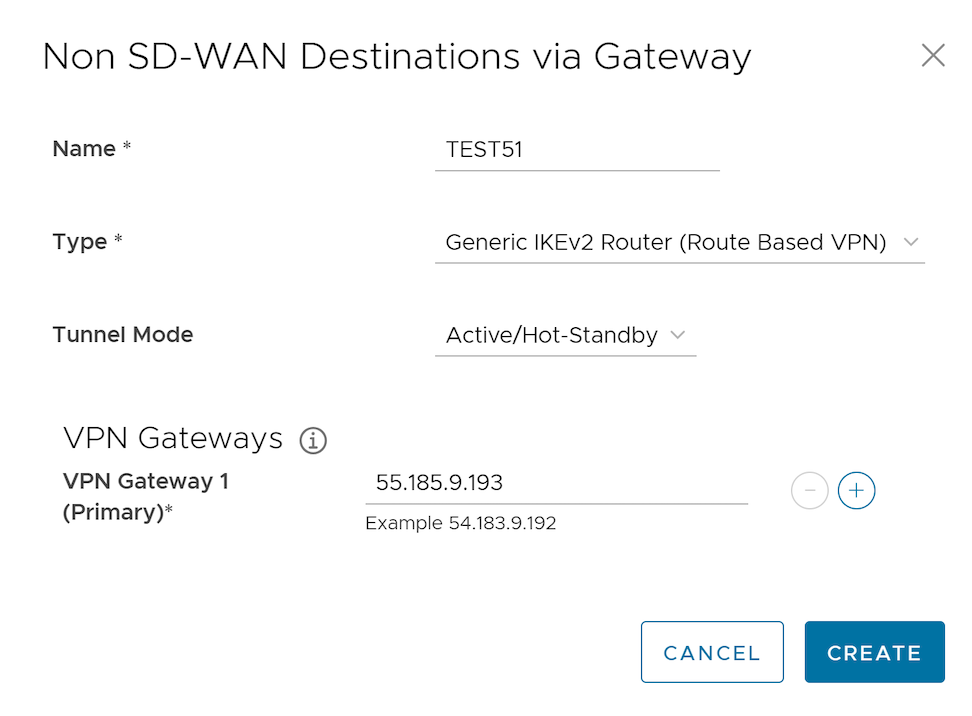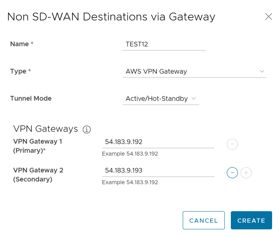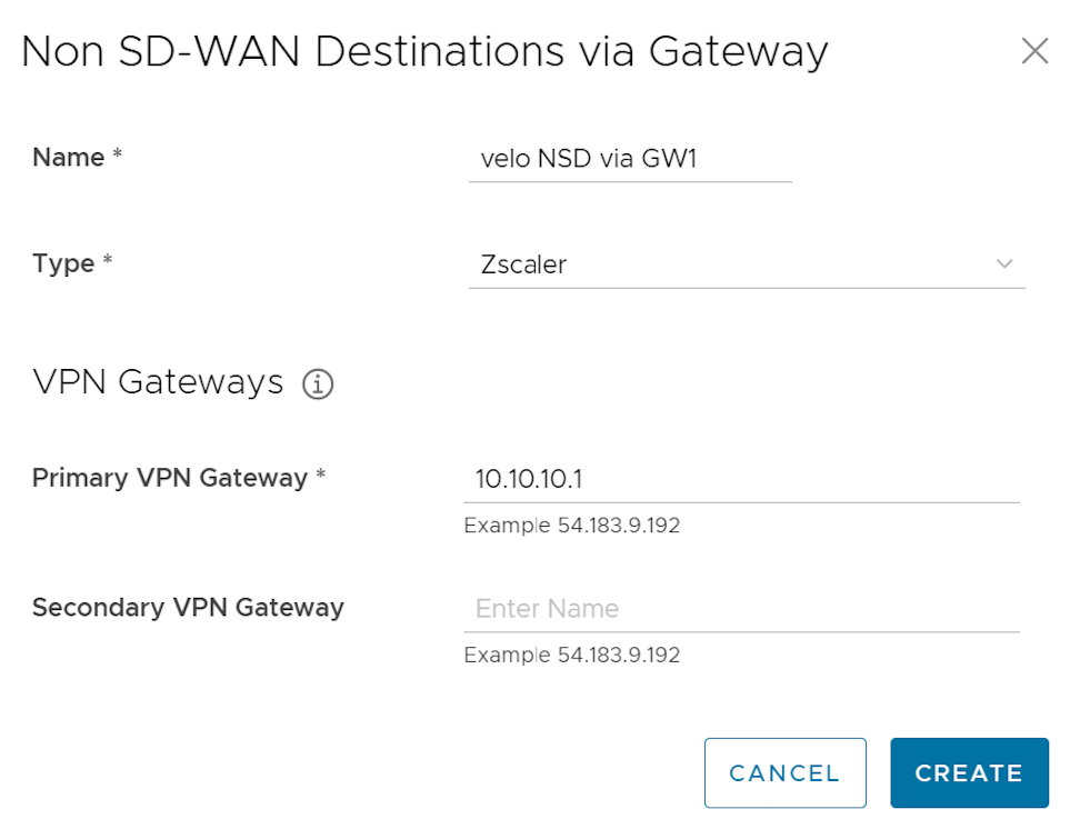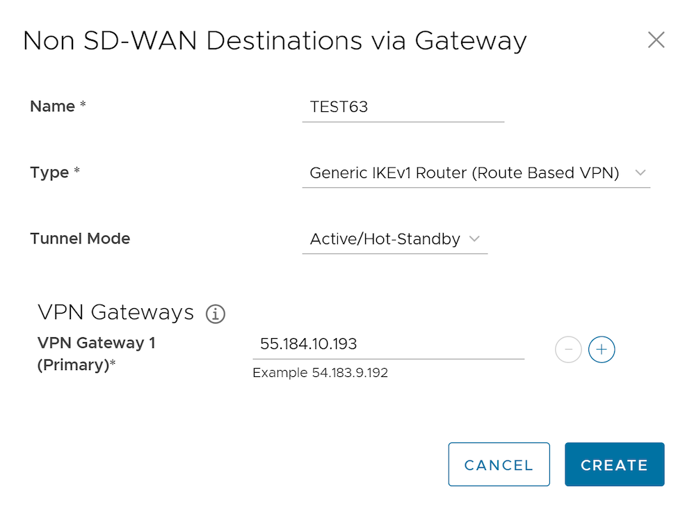 VeloCloud SD-WAN allows the Enterprise users to define and configure a Non SD-WAN Destination instance to establish a secure IPsec tunnel to a Non SD-WAN Destination through an Gateway.