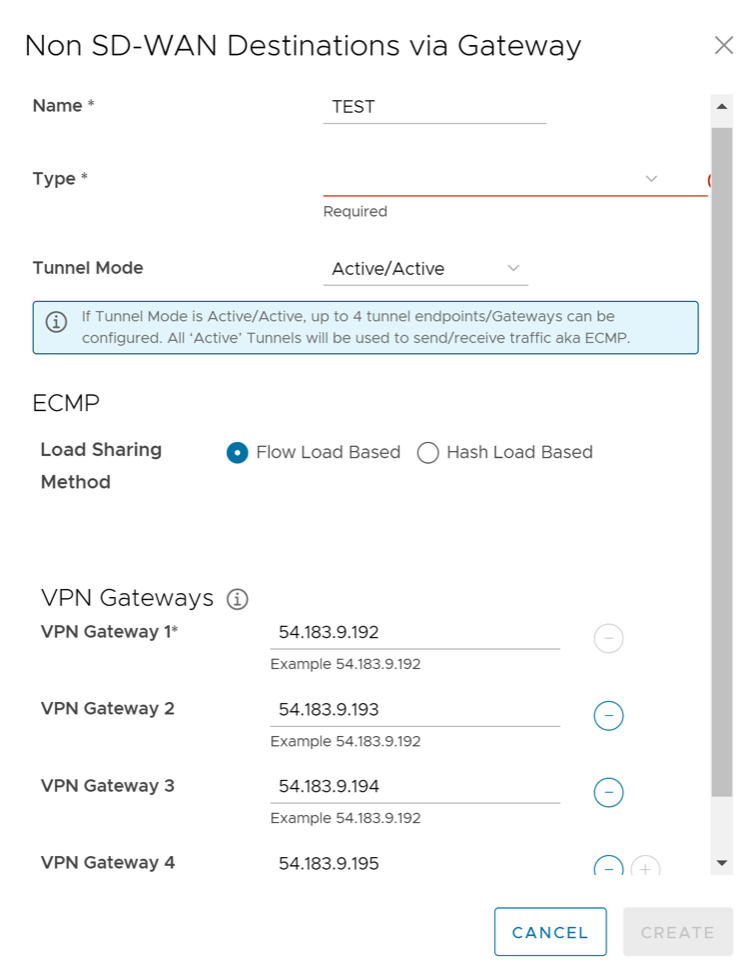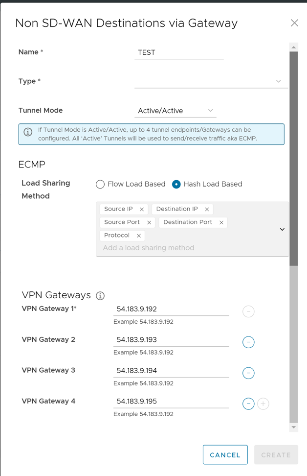 Note: When the Non SD-WAN Destination via Gateway type is configured as Active/Hot-Standby and the peer end is configured as Active/Active, then the Non SD-WAN Destination via Gateway accepts the traffic received over Hot-Standby tunnel.ECMP Load Sharing Method Flow Load Based (Default) Flow load based algorithm maps the new flow to the path with least number of flows mapped among the available paths to the destination. Hash Load Based algorithm takes input parameters from 5-tuple (SrcIP, DestIP, SrcPort, DestPort, Protocol). These inputs can be any or all or any subset of this tuple based on user configuration. Flow is mapped to the path based on hash value with selected inputs. VPN Gateways VPN Gateway 1 Enter a valid IP address. VPN Gateway 2 Enter a valid IP address. This field is optional. VPN Gateway 3 Enter a valid IP address. This field is optional. VPN Gateway 4 Enter a valid IP address. This field is optional. Note: The Gateway functions as the tunnel initiator in tunnel negotiation and cannot be configured to serve as the tunnel responder during the negotiation process. - Configure a Non SD-WAN Destination of Type AWS VPN Gateway