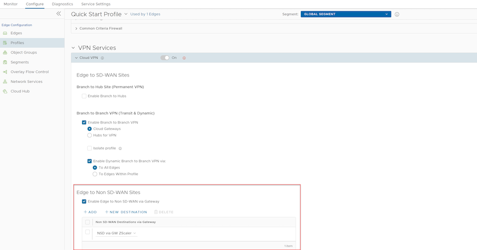 - Associate a Non SD-WAN Destination Network Service to a Profile or Edge.