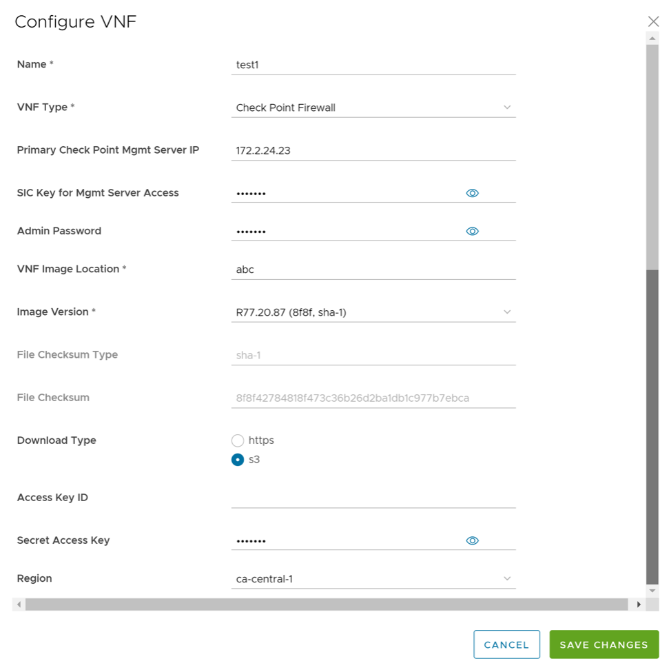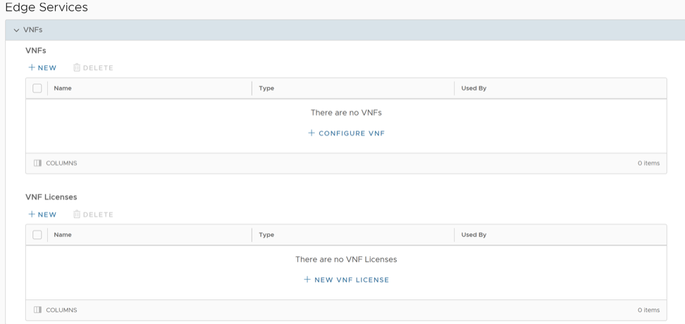 This section allows you to configure VNFs and VNF Licenses. Virtual Network Functions (VNFs) are individual network services, such as routers and firewalls, running as software-only Virtual Machine (VM) instances on generic hardware.