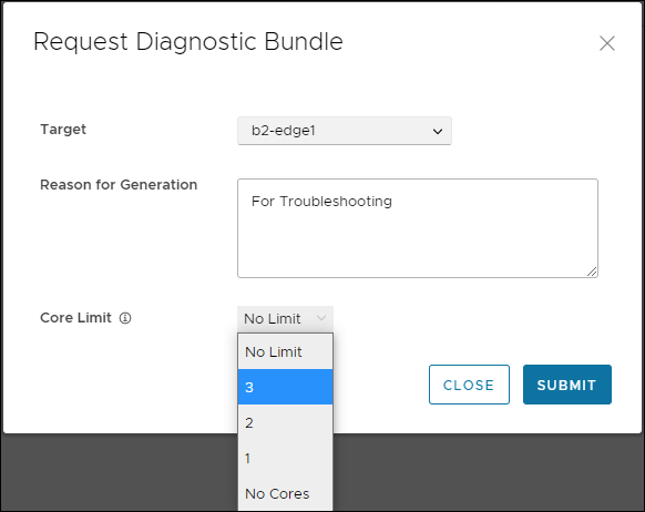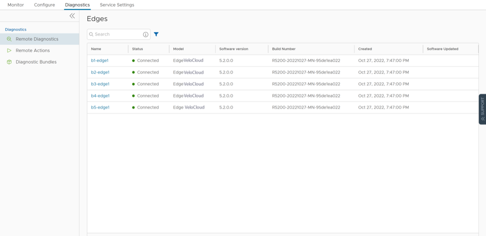 • Request Diagnostic Bundle – The Diagnostic bundle is a collection of all the configuration and logs from a specific Edge. Only Operators can request Diagnostic bundles. For additional information, see Request Diagnostic Bundle.