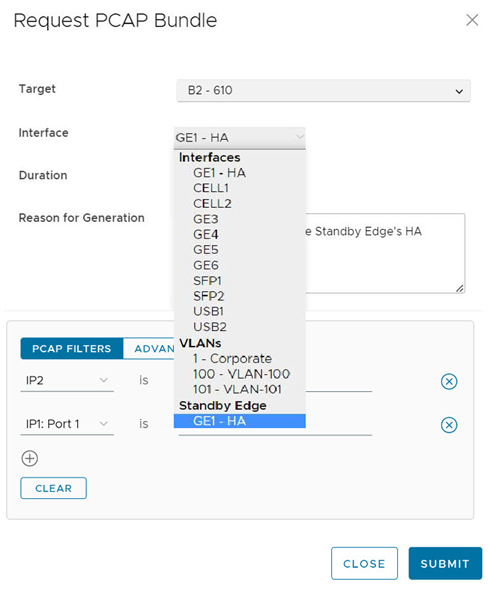 In Release 5.2.0 and later, a user can request a packet capture for the Standby Edge's HA interface, the interface that connects the Standby Edge to the Active Edge. This option appears at the bottom of the menu and reads: Standby Edge, and then lists the HA interface.