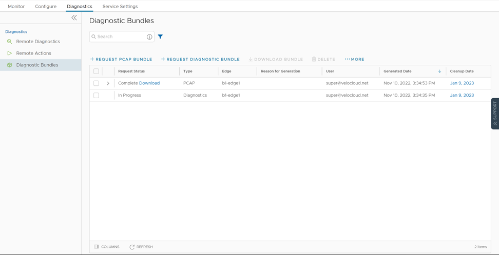 Note: The Request Diagnostic Bundle option is available only for an Operator user. If you are a Partner user or an Enterprise user, you can request for a PCAP Bundle.