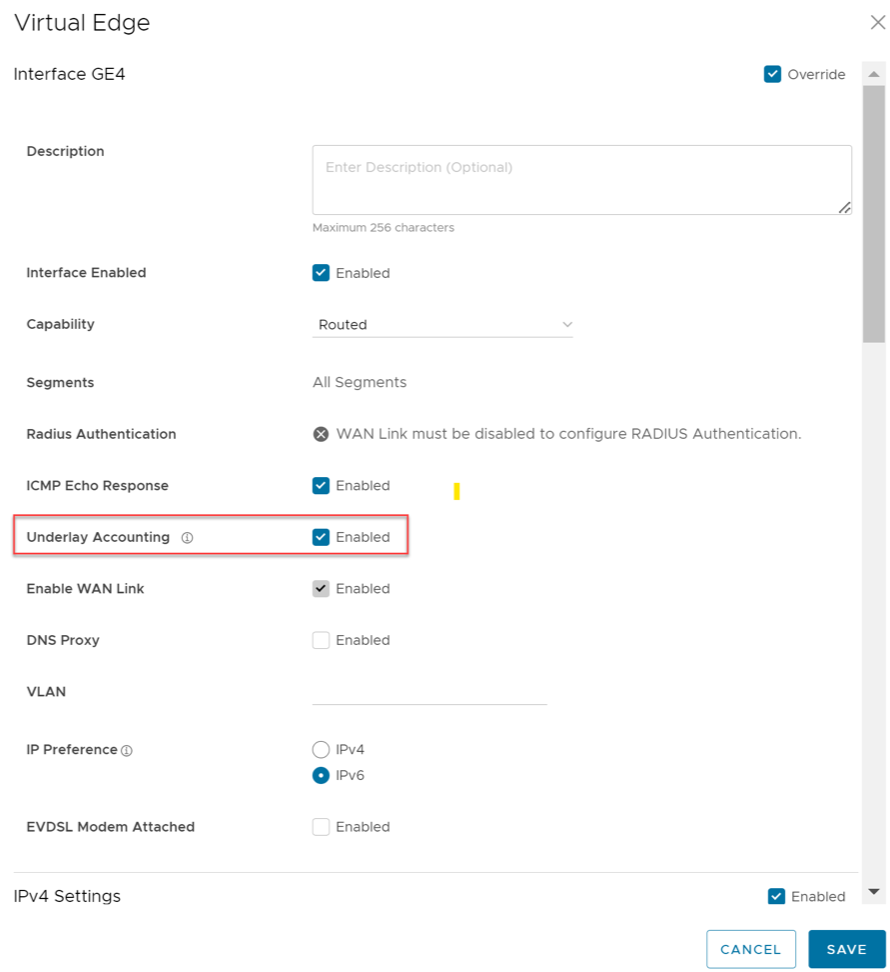 - Verify that Underlay Accounting is activated for WAN Overlay by default in the Orchestrator by navigating to and select a Edge model.
