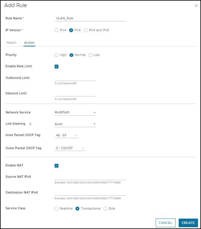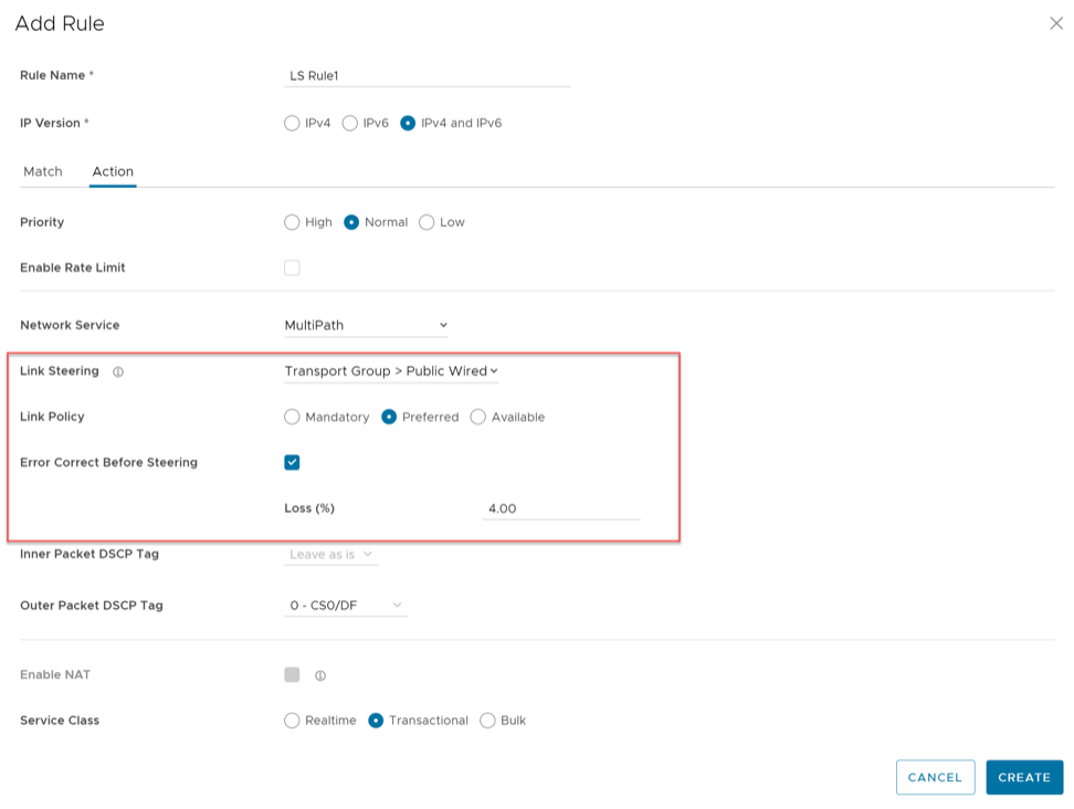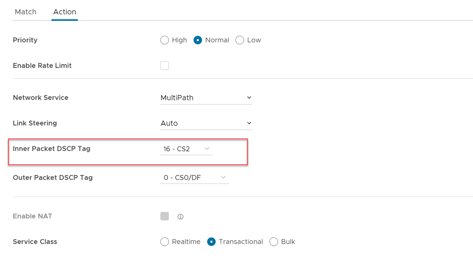 - Configure Action criteria for the Overlay traffic and configure Inner Packet DSCP Tag and Outer Packet DSCP Tag.