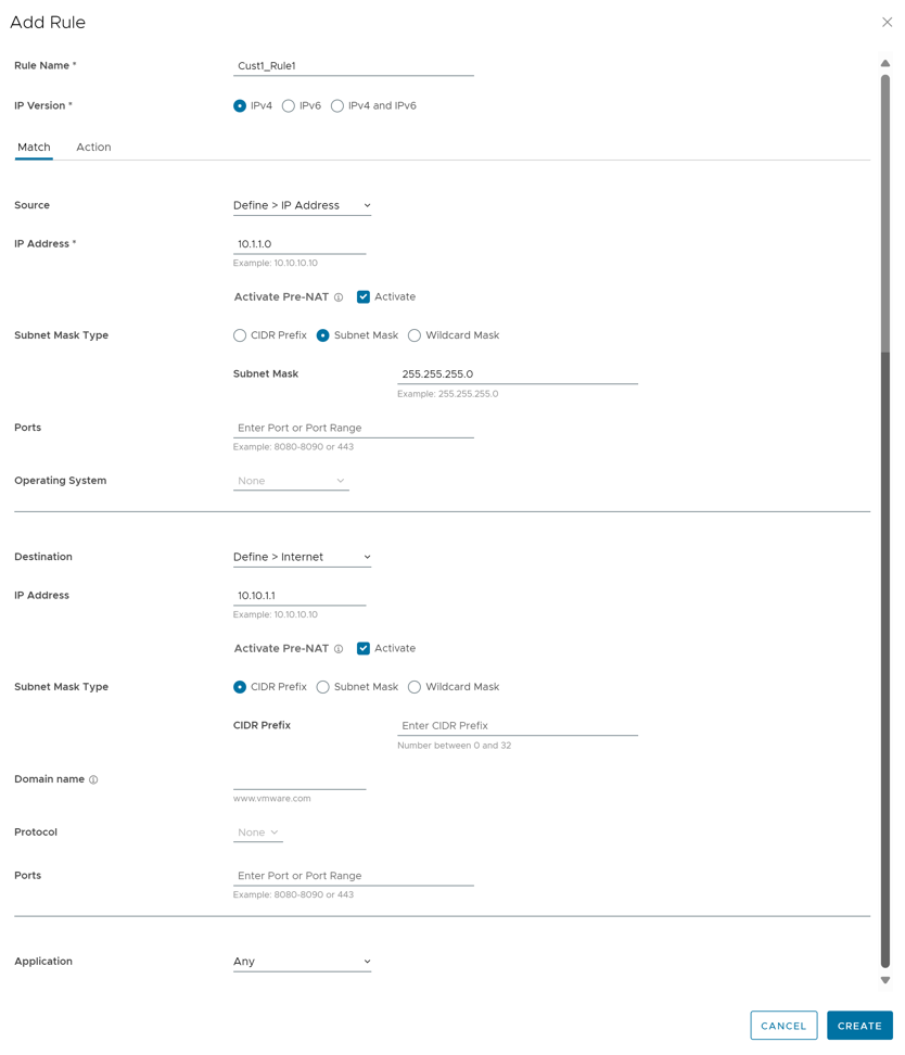 You can configure Policy-based NAT for both Source and Destination. The NAT can be applied to either Non SD-WAN Destination traffic or Partner Gateway Handoff traffic using Multi-path. When configuring NAT, you must define which traffic to NAT and the action you want to perform. There are two types of NAT configuration: Many to One and One-to-One.