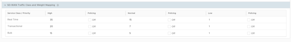 - In the SD-WAN Traffic Class and Weight Mapping area, enter numerical values for Real Time, Transactional, and/or Bulk as necessary.