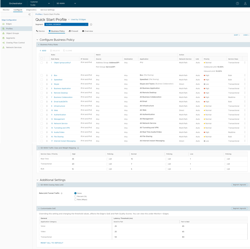 Business Policy Rules are now Segment aware. All Segments available for configuration are listed in the Segment drop-down menu, located at the top of the screen. By default, Global Segment [Regular] Segment is selected. When you choose a Segment to configure from the Segment drop-down menu, the settings and options associated with that Segment appear in the Configure Business Policy area. For additional information. see Configure Segments with new Orchestrator UI.