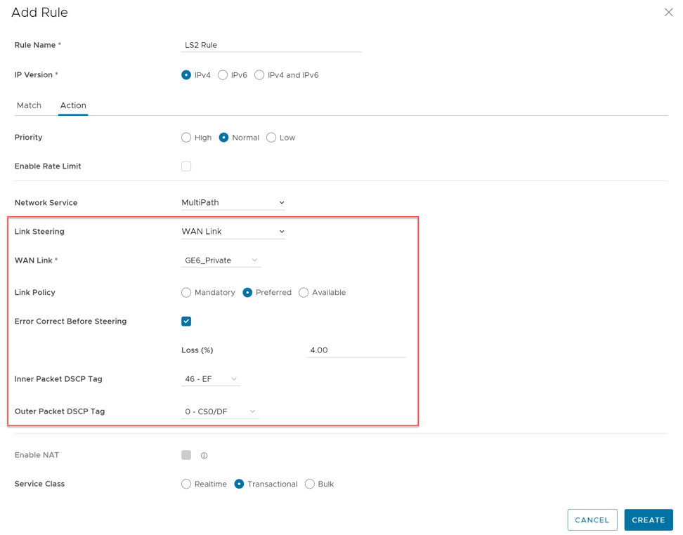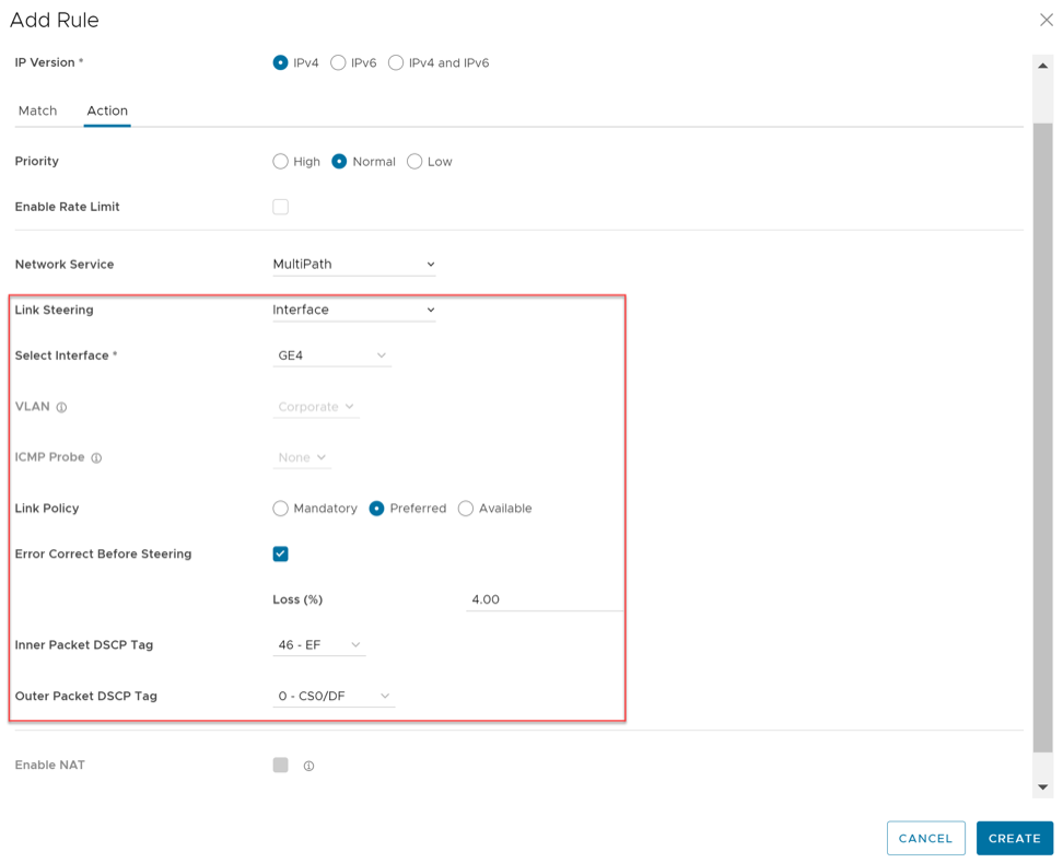 For this option, the link steering is tied to a physical interface. Link steering by interface will be used primarily for routing purposes. However, even though it logically should only be used for routing traffic directly from the VeloCloud Site, if the rule specified has a Network Service requiring Internet Multi-path benefits, it will pick a single WAN link connected to the interface.