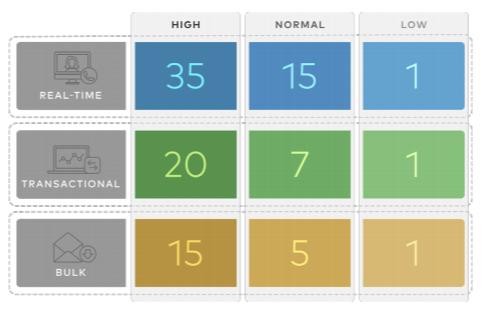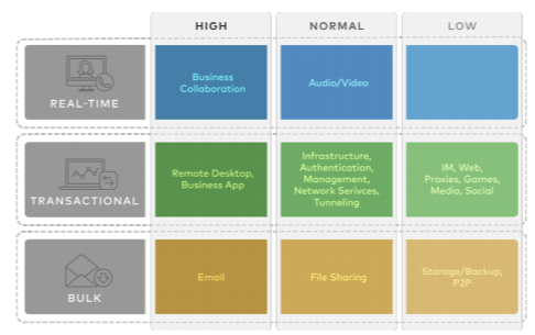 A Traffic Class is defined with a combination of Priority (High, Normal, or Low) and Service Class (Real-Time, Transactional, or Bulk) resulting into a 3x3 matrix with nine Traffic Classes. You can map Application/Category and scheduler weight onto these Traffic Classes. All applications within a Traffic Class will be applied with the aggregate Quality of Service (QoS) treatment, including Scheduling and Policing.