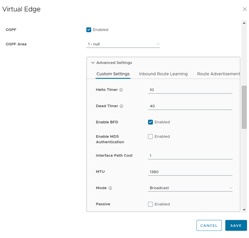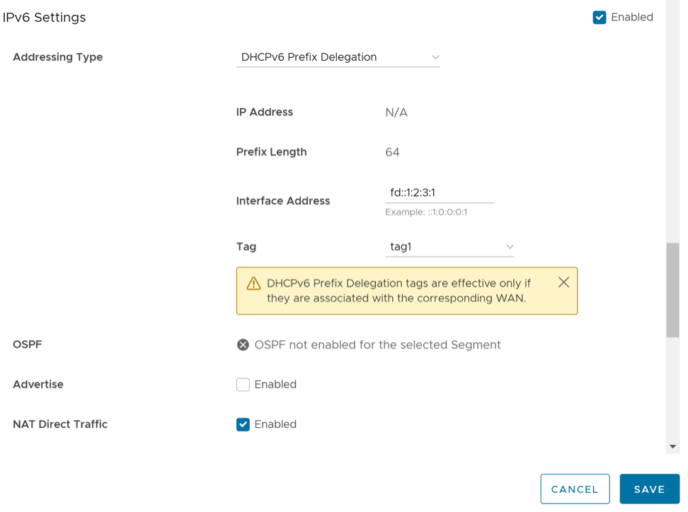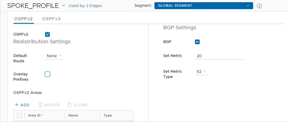 OSPF This option is available only when you have configured OSPF at the Profile level for the selected Segment. Select the check box and choose an OSPF area from the drop-down list.