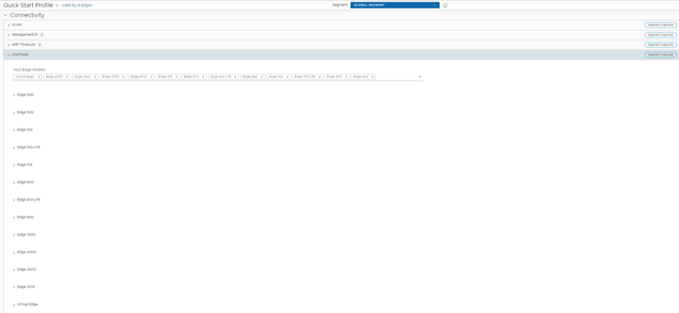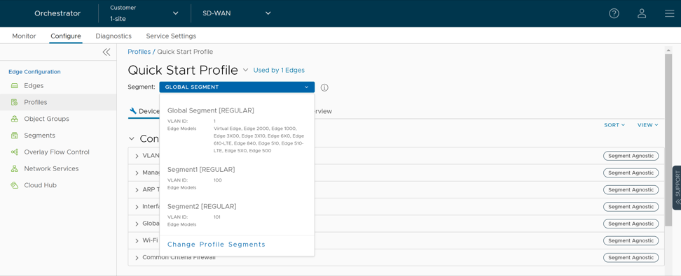 After you have assigned a Segment to the Profile, you can configure your Segment through the Segment drop-down menu. All Segments available for configuration are listed in the Segment drop-down menu. If a Segment is assigned to a VLAN or interface, it will display the VLAN ID and the Edge models associated with it.
